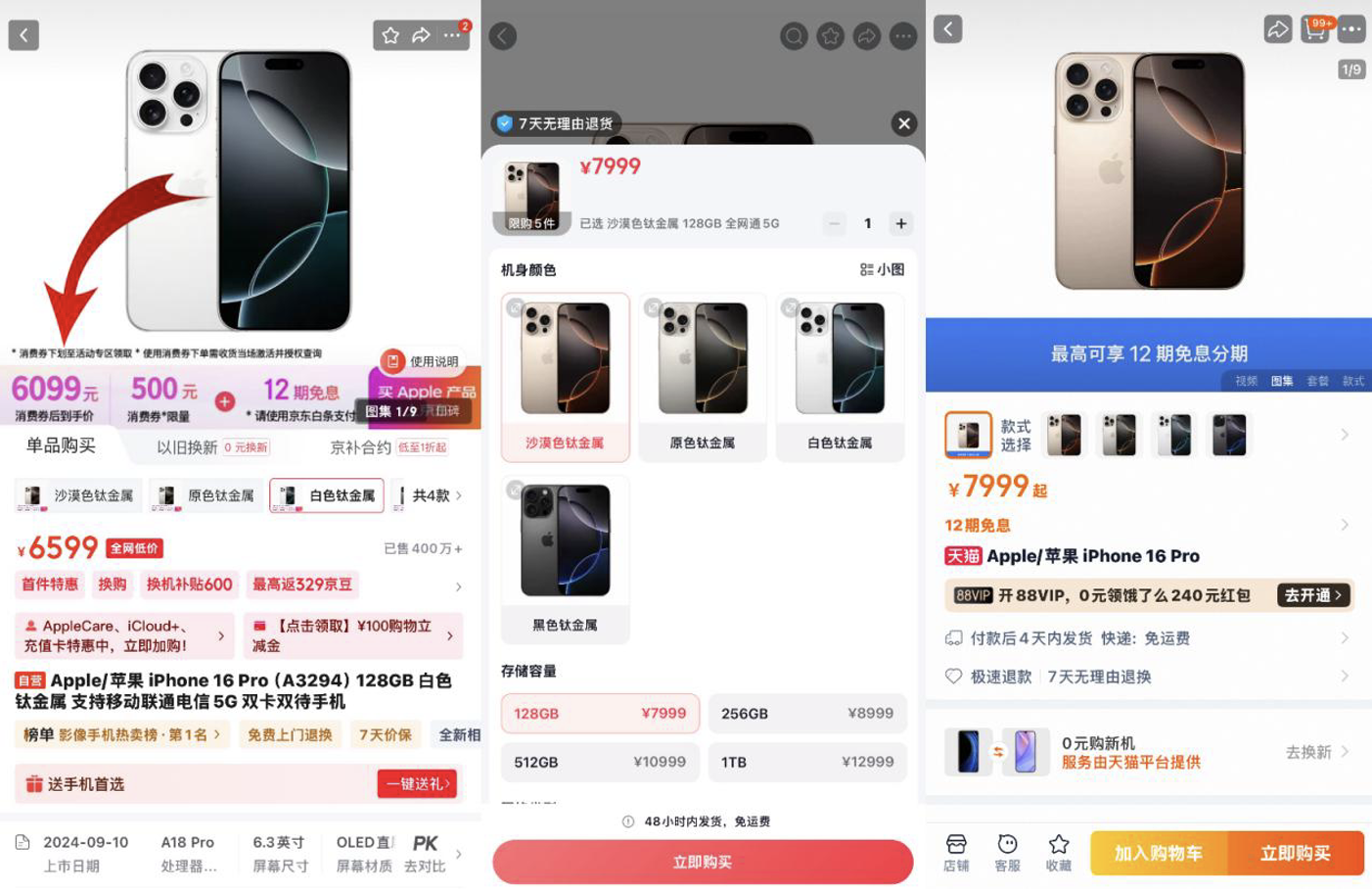对于不参与国补的高端机型,平台价格差异更为显著。以128G的iPhone 16 Pro为例,原价7999元,京东提供限量500元的全国消费券,叠加1400元的直降优惠,最终到手价仅为6099元;而抖音和天猫都无优惠保持原价,和京东的价差高达1900元;512G的iPhone 16 Pro Max同样如此,京东使用消费券后到手价10099元,支持以旧换新加补400元,还可享受12期免息;抖音、天猫虽说都提供免息,但价格仍比京东高出1900元。