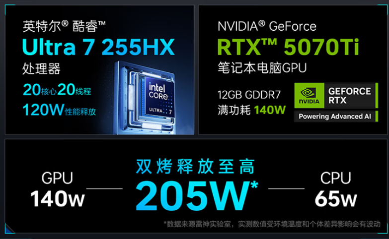 硬件升级:同样搭载酷睿 Ultra7 255HX 处理器,配备性能更强的 RTX5070Ti 独显(GPU AI 算力 992 TOPS),支持更高画质与光追效果;240Hz 2.5K 屏幕,兼顾高帧与色彩,适合专业电竞与内容创作。