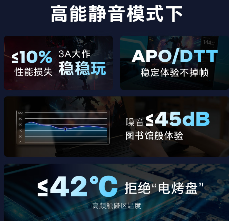 静音散热双优:英特尔 “AI 高静游戏本” 技术加持,双风扇 + 7 热管 + 大面积均热板,噪音控制在 45dB 以下(堪比图书馆翻书声),机身表面温度低于 42℃,裸手操作不烫手;开启 “静音高能模式”,可在平衡功耗的同时保持 90% 性能,帧率稳定无波动。