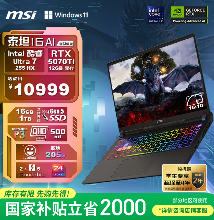 价格与优惠:活动价 10999 元,叠加 20% 国补后立省 2000 元,适合预算 10000 元以下、追求极致性能的发烧友。