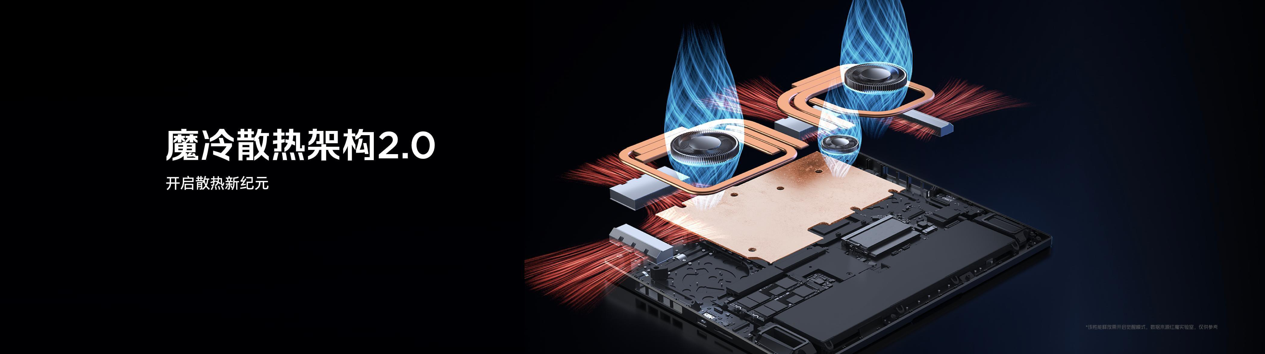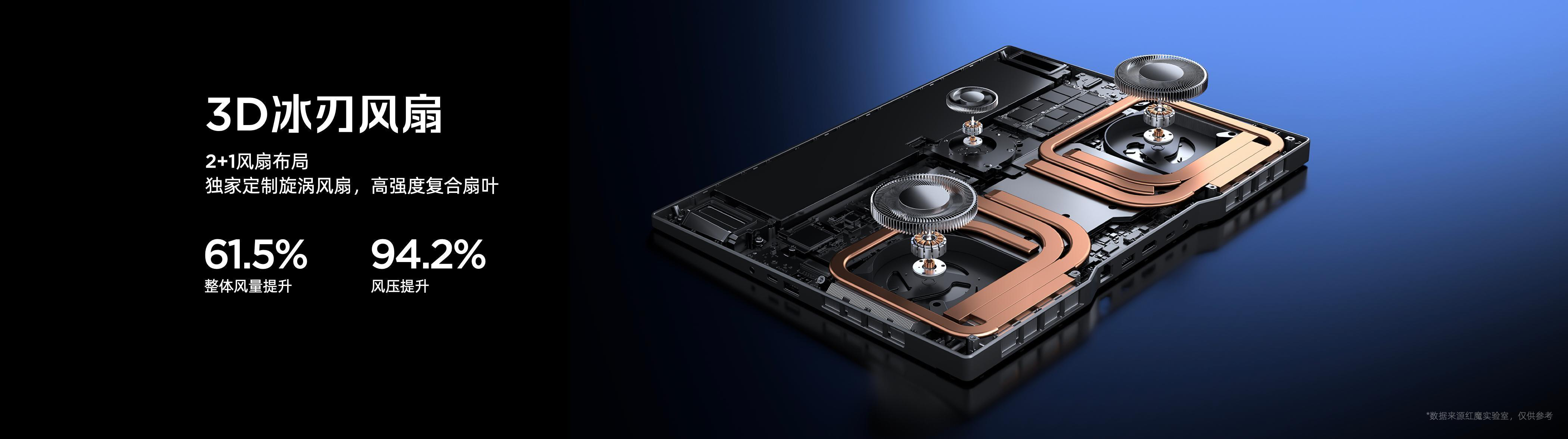 红魔游戏本16 PRO升级魔冷散热架构2.0,从导热、散热多维度优化,确保高负载下机身不发烫、性能不降频。采用3D冰封复合式热管2.0,搭载4+2矩阵式排布的超宽高效热管+独家定制方形铜管,相比传统热管接触面积提升10%,导热效率提升30%,能将核心热量快速散出。配备超大 VC 均热板与超低热阻相变材料,均热能力强且轻薄省空间,持续性能提升 40%。另外还采用了2+1风扇布局的3D冰刃风扇,独家定制旋涡风扇与高强度复合扇叶,风压提升94.2%,整体风量提升61.5%,能快速将散热鳍片上的热量排出机身,避免热量堆积。