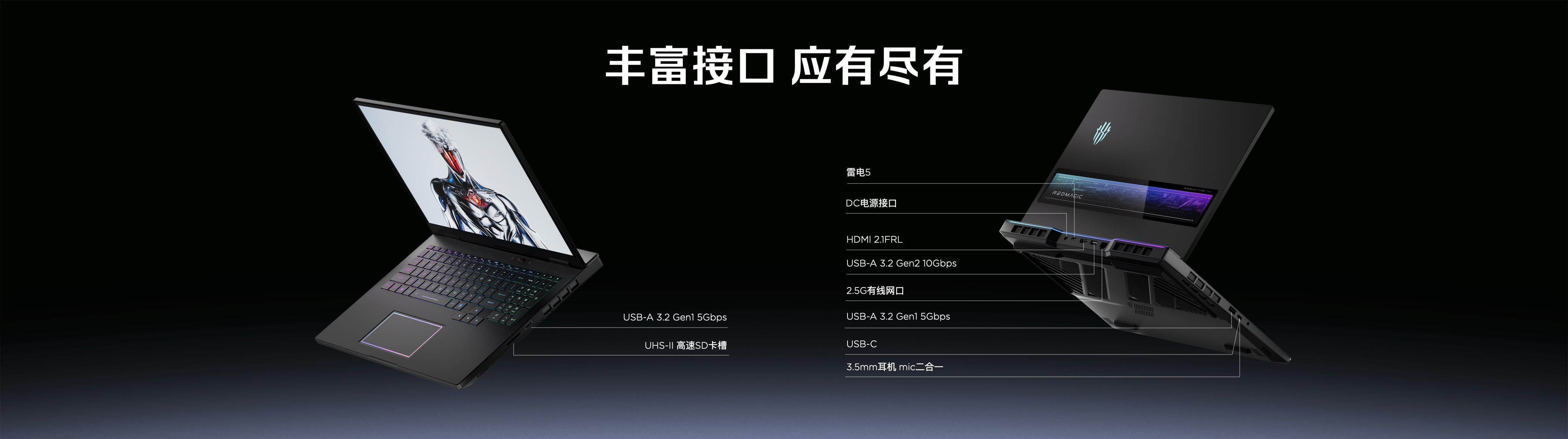 红魔游戏本16 PRO配备全场景接口,无需依赖拓展坞,即可连接多种外设。配备雷电5接口,同时包含2.5G有线网口,网络传输稳定,适合对网速要求高的在线游戏、直播场景。搭载HDMI 2.1 FRL接口,可外接高刷新率显示器,打造多屏游戏或办公场景;配备3个USB-A接口,可同时连接键盘、鼠标、U盘、手柄等外设,无需频繁切换接口。