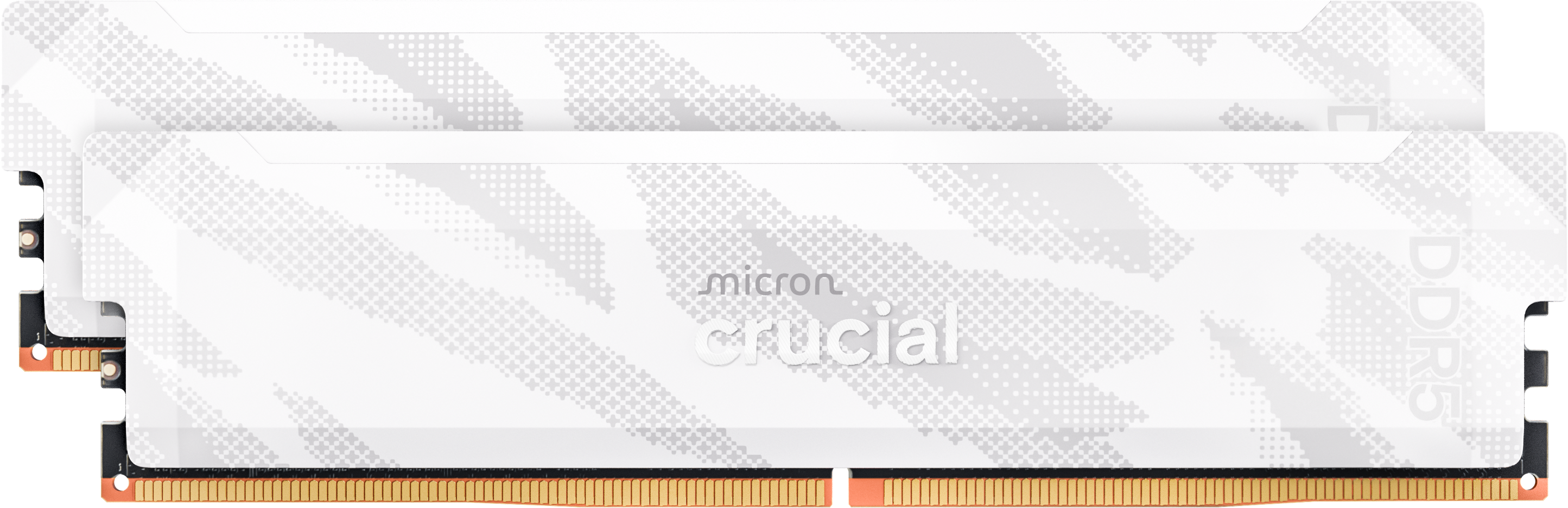 Crucial 英睿达的精致散热器采用迷彩图案的全新设计,提供哑光黑或雪狐白两种配色,兼具功能与美感。以钻石切割的 Crucial 英睿达标识与醒目的 “Crucial Pro” 侧边品牌字样,呈现出精致且战术感十足的外观。全新散热片兼顾耐用性与可靠的冷却性能,外观简洁现代,与高性能的配置完美契合。