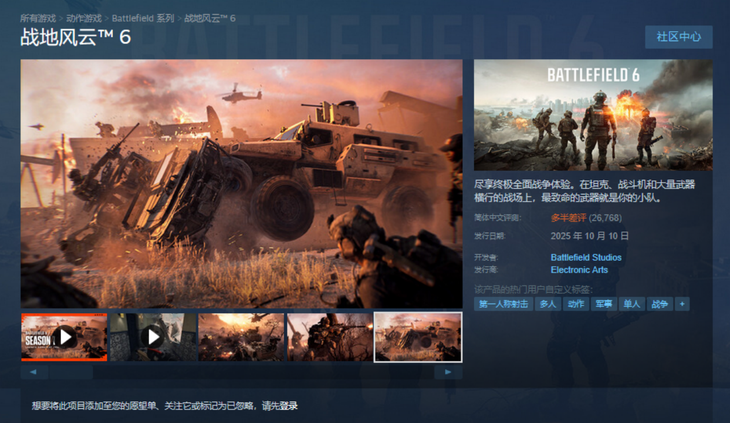 说到近期最火爆的第 一人称射击联机游戏,当属上个月刚刚发售的《战地风云6》了,这款由EA发行的全球知名大作续作一上线就取得了首周登顶STEAM全球销量榜第四,三天内全球销量突破700万份。