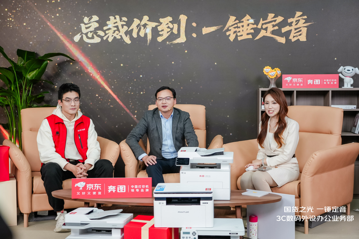 压轴登场的奔图,以“极地科考级品质”为核心叙事,将直播推向高潮。奔图研发总监陈泽福在砸向“卡纸痛点”金蛋时,举起奖杯感慨:“奔图打印机在零下30℃南极都能连续输出40万页,今天在直播间,咱们用0.02‰卡纸率的技术兑现‘极地级承诺’。”随后抽送的扛打系列打印机免单名额,彻底点燃用户热情。直播尾声的全网比价环节,用户连线成功即享免单,京东采销更是现场调价“比竞对再打9折”,以“真低价、敢比对”讲整场直播再度推向了高潮。