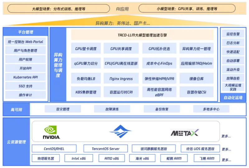 平台还提供统一的运维运营门户,集成监控中心、日志平台、巡检、变更发布、运维工具、安全中心、容灾管理、故障演练等功能模块,有效简化了日常运维流程。这套智能运维解决方案通过自动化扩缩容、智能故障诊断与自愈等创新功能,不仅显著降低了运维人力成本,更确保了异构算力资源的高效稳定运行,为用户提供了更加可靠的算力保障。同时支持多地多中心高可用部署架构,强大的运维及容灾能力帮助上层业务达到金融级高可用能力。