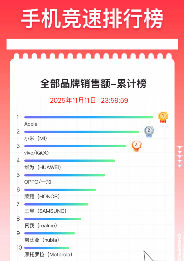 双十一手机销量出炉:苹果稳坐多项冠军,小米位列第二