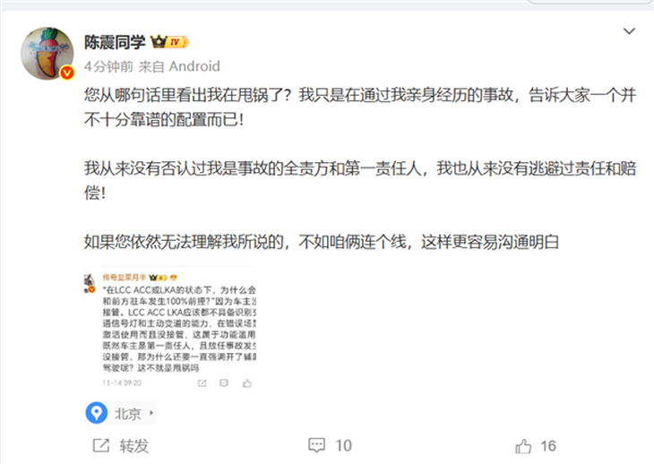 陈震进一步指出,虽然自己没有“甩锅”,但他通过亲身经历向大家提醒,某些辅助驾驶配置可能并不可靠。他提到,尽管闪灵配备了高端的辅助驾驶技术,但在实际操作中,这些技术却未能如预期般有效,尤其是最基础的主动安全功能似乎存在缺陷。