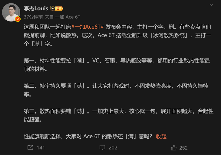 一加Ace 6T将在本月正式亮相,目前新机已经进入预热阶段。作为一加的旗舰新品,这款手机的亮点之一就是搭载了全新升级的“冰河散热系统”,主打“满”字理念,专注于提升手机的散热性能。根据一加中国区总裁李杰的介绍,这款散热系统在多个方面进行了优化。
