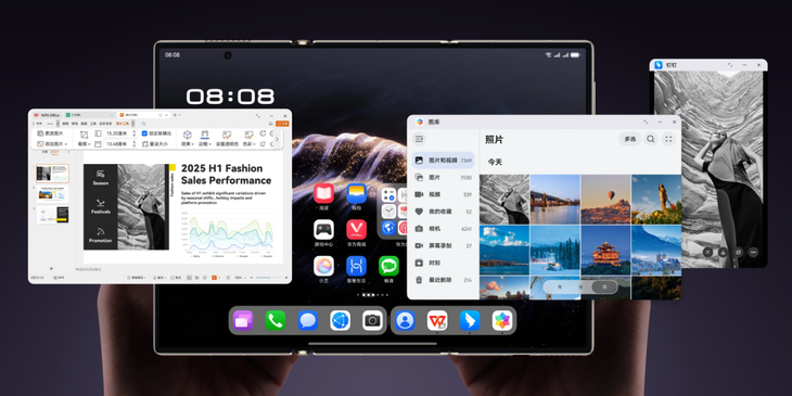 除了外观上的优势,其最大突破在于首次将PC级应用生态引入移动端。通过HarmonyOS深度优化,华为Mate XTs 非凡大师支持WPS Office、Wind金融终端等专业软件的PC版本直接运行,无需降级适配。配合PC级多窗口交互能力——用户可同时开启三个独立应用窗口,自由拖拽文件、跨应用复制粘贴,操作逻辑与桌面电脑高度一致。