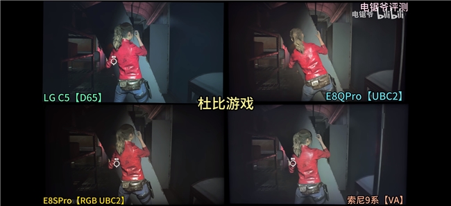 而在亮度和对比度方面,RGB-Mini LED的表现同样出色。首先是亮度上,在海信E8S Pro最高9360个背光分区和6200nits峰值亮度的绝对优势面前,OLED自身亮度偏低的短板尽显。其次是对比度上,OLED一直以黑场纯净著称,但海信E8S Pro却能通过108bits的精准控制,做到高亮场景耀眼而不刺眼,暗场表现更是不逊色于OLED,例如这组杜比游戏的对比中,海信E8S Pro对黑暗的深邃感营造就比LG C5更出色。