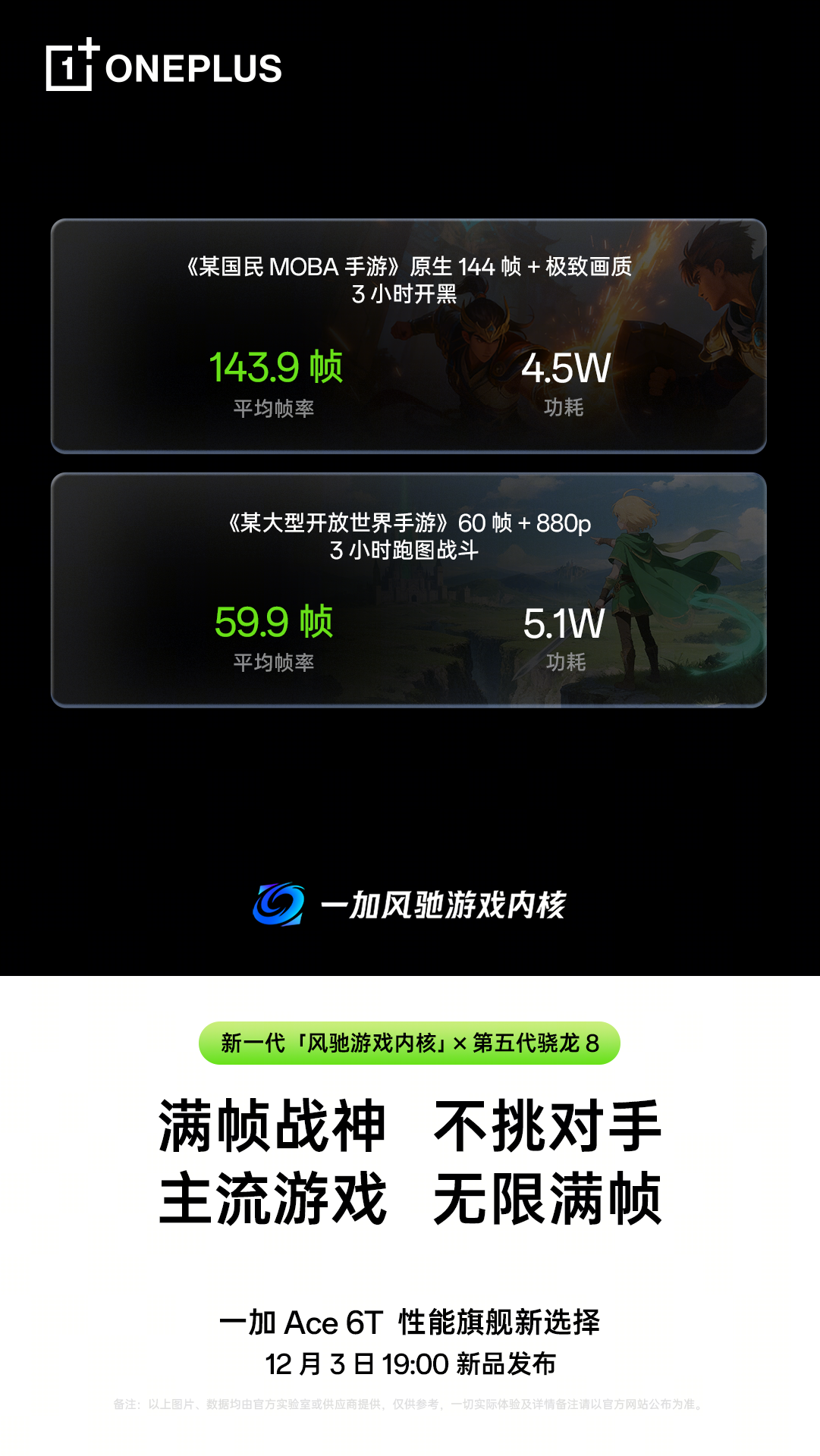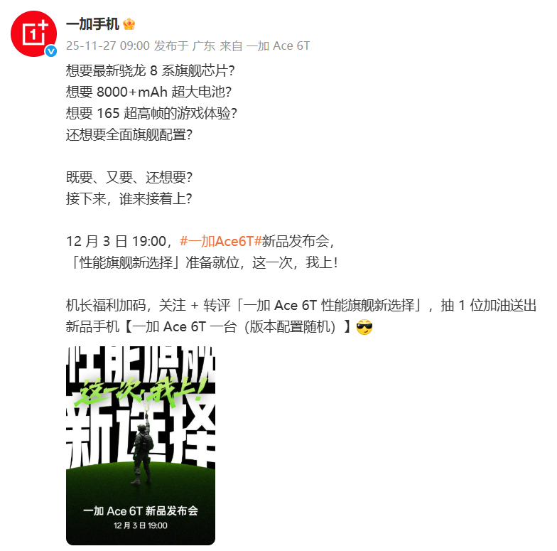 2025年11月27日,一加官方微博宣布一加 Ace 6T新品发布会定档12月3日晚 7 点,一加 Ace 6T首发当代旗舰芯——第五代骁龙 8 ,在全新一代「风驰游戏内核」和「冰河散热系统」加持下,将实现同档唯一165无限满帧游戏体验,并行业首发《和平精英》原生 165Hz 高刷新帧率模式,以极致流畅,定义性能旗舰标准。