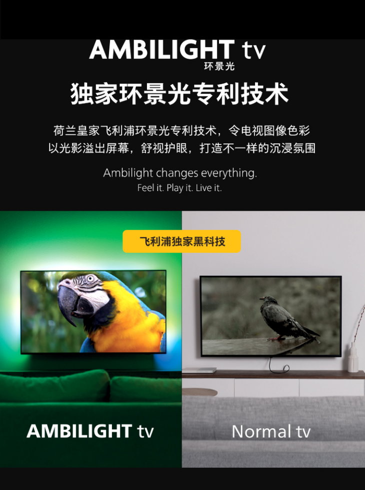基于深耕多年的创新成果,飞利浦独家环景光技术采用第十代Ambilight算法,LED背光与画面实时同步,让色彩溢出屏幕,带来全新视觉体验。在“跟随电视”模式、“跟随音乐”模式、“跟随国旗”模式下,飞利浦环景光电视,将画面的色彩原汁原味地延伸到屏幕外,画面颜色流转变化、光影色彩如影随形,仿佛影像视界跃出屏幕,让你豪情澎湃,沉浸式观赛。