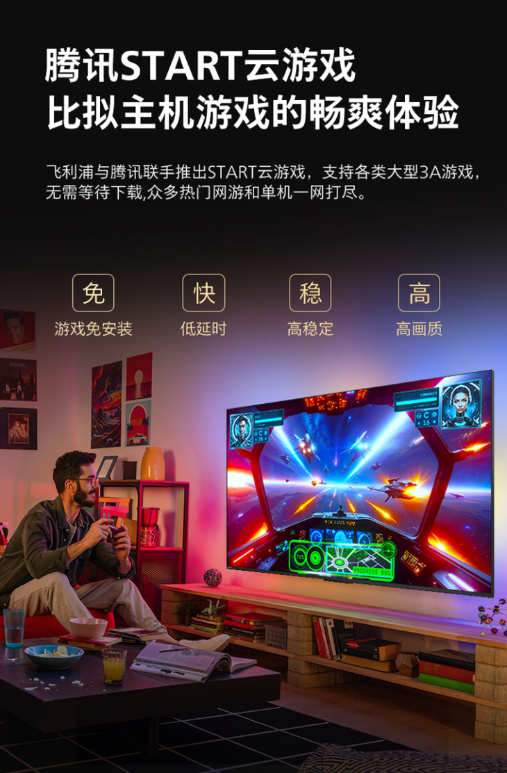 当APL总决赛的职业选手操作让你热血沸腾时,只需拿起手柄,就能立即通过飞利浦PQF8580环景光游戏电视,进入游戏开启竞技激战。飞利浦与腾讯联手推出START云游戏,支持各类大型3A游戏,无需等待下载,直接将观赛的兴奋感转化为游戏体验,让“赛后手痒”的需求秒级满足。