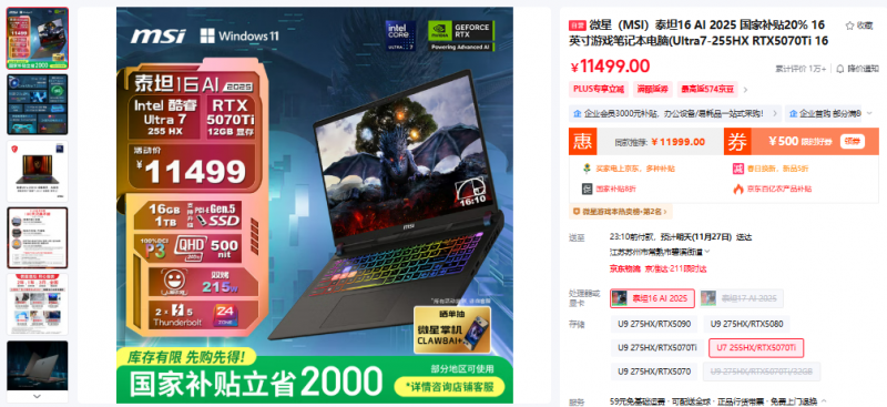 官方京东自营旗舰店:活动价11499元,国补立省2000元