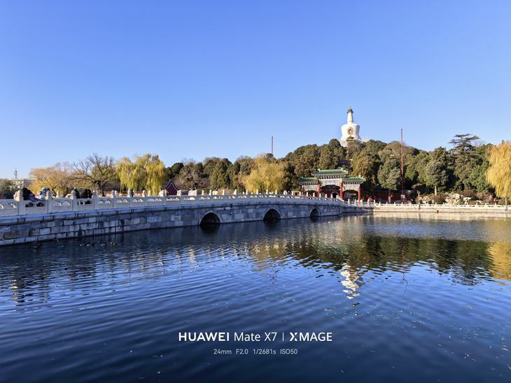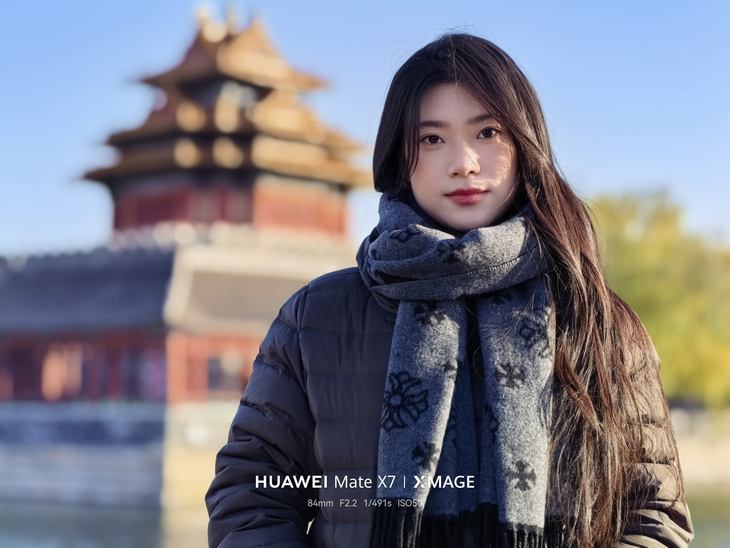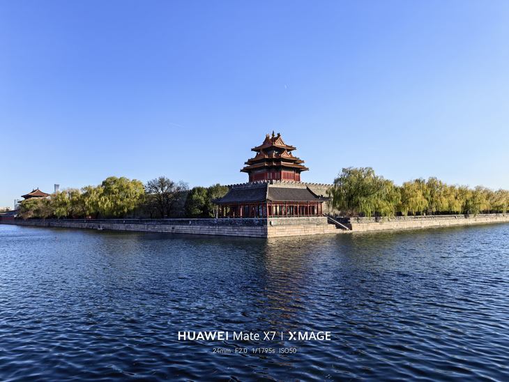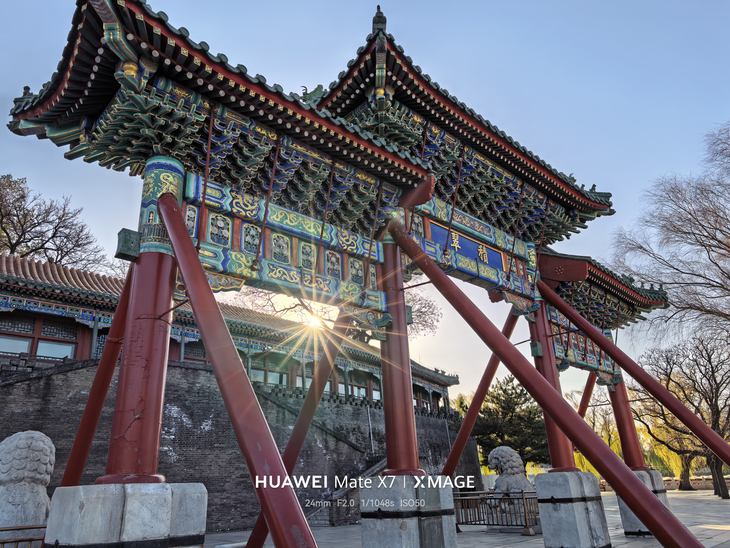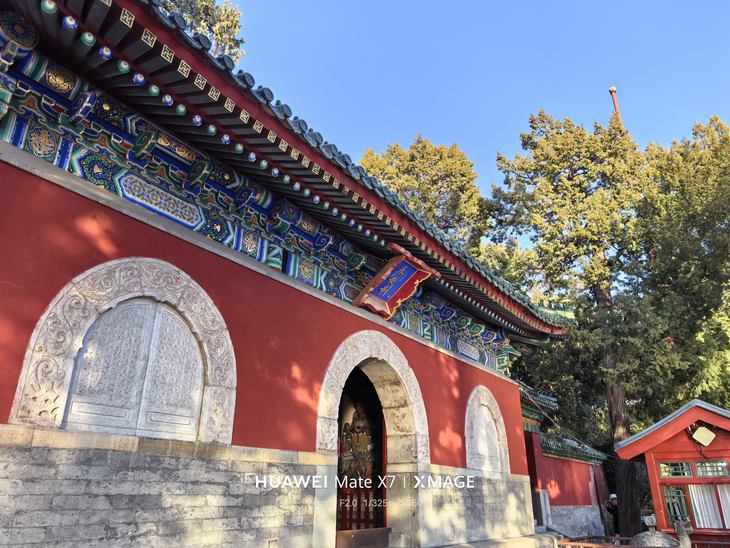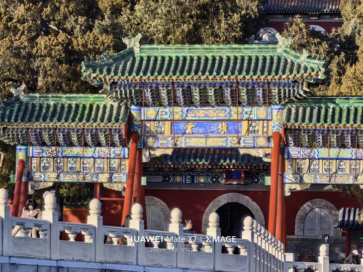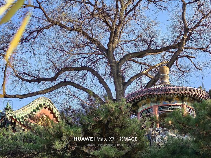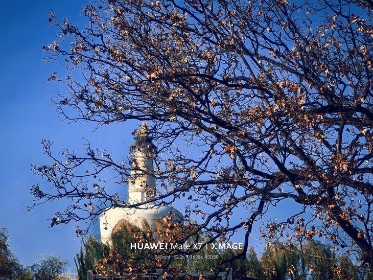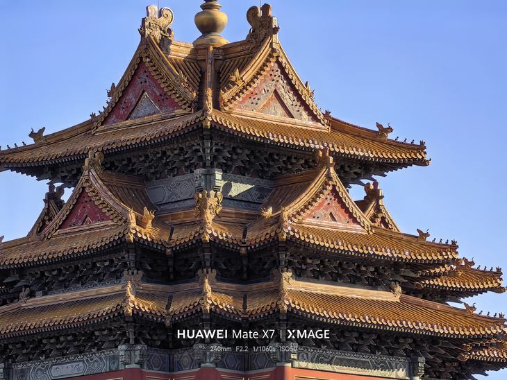 从实拍的样片来看,在光线充足的情况下,华为Mate X7的表现非常出色,主摄细节清晰锐利,色彩还原准确,画面通透自然。即使放大照片,也能看到建筑上的精美纹饰。