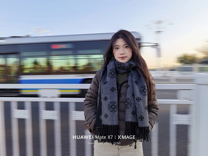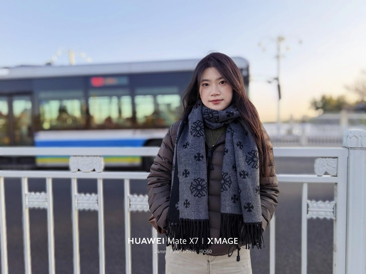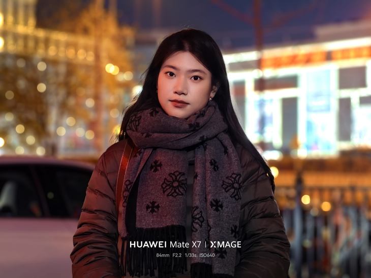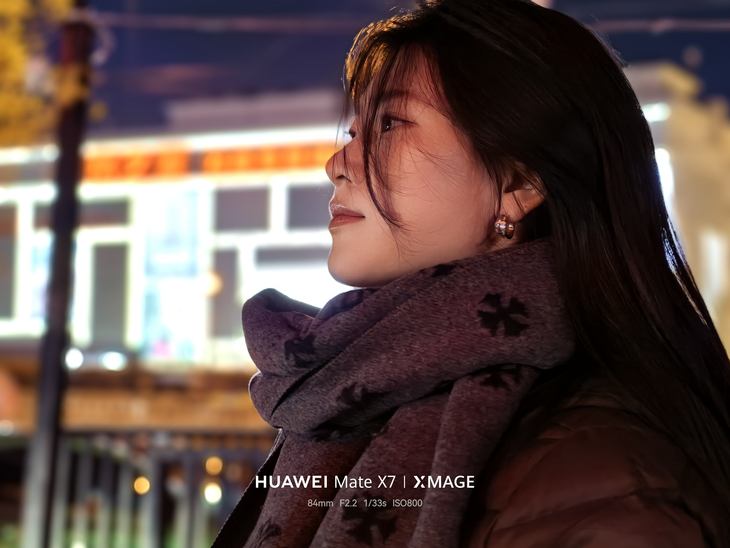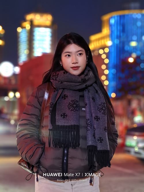 夜晚用华为 Mate X7 在户外广告牌前拍摄的这几张人像,表现依然稳定。即使面对强烈的灯光对比,也能准确还原人物肤色,不会出现过曝或偏色的情况。夜景人像,也能拍出高级感。