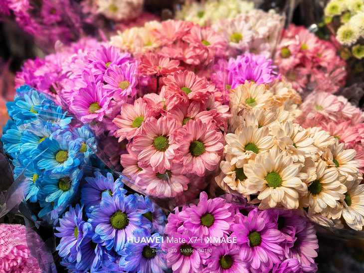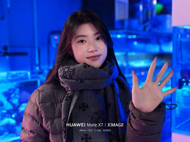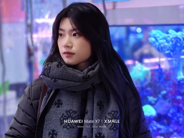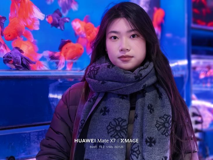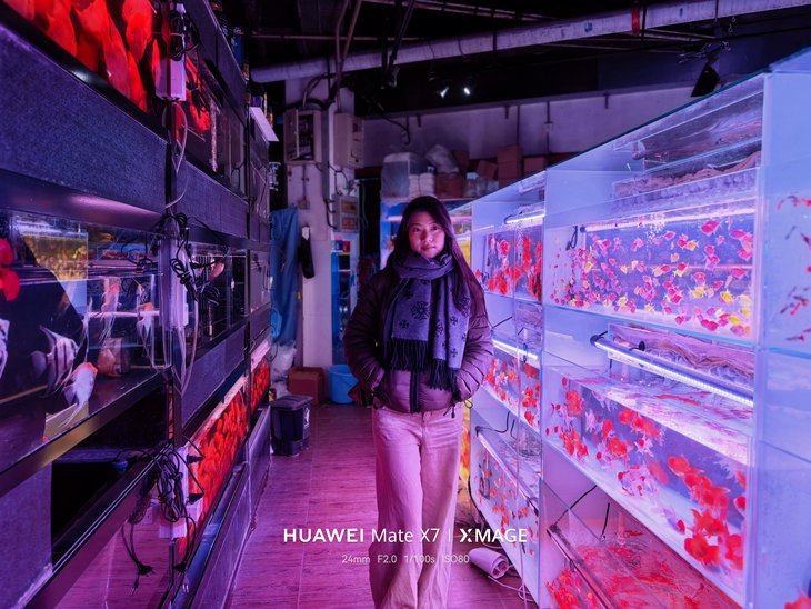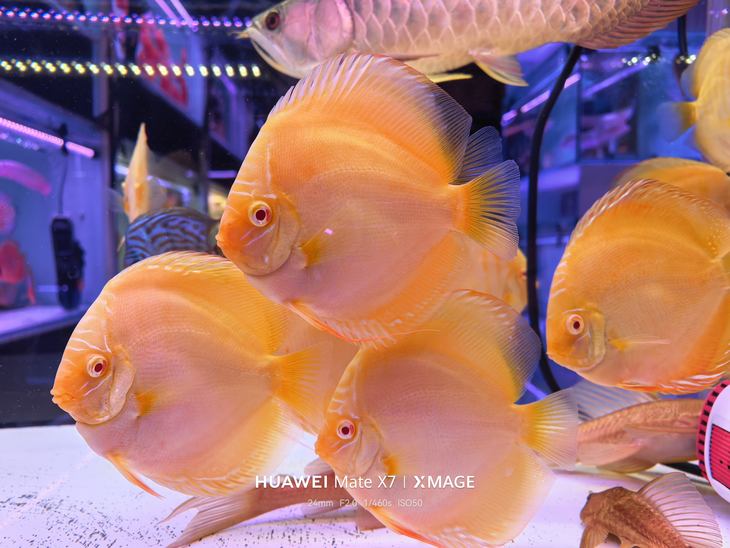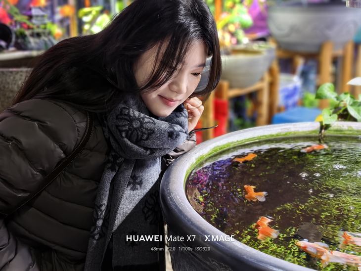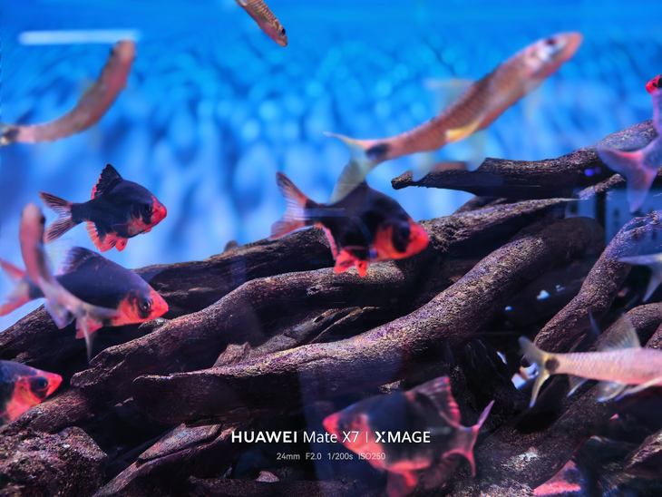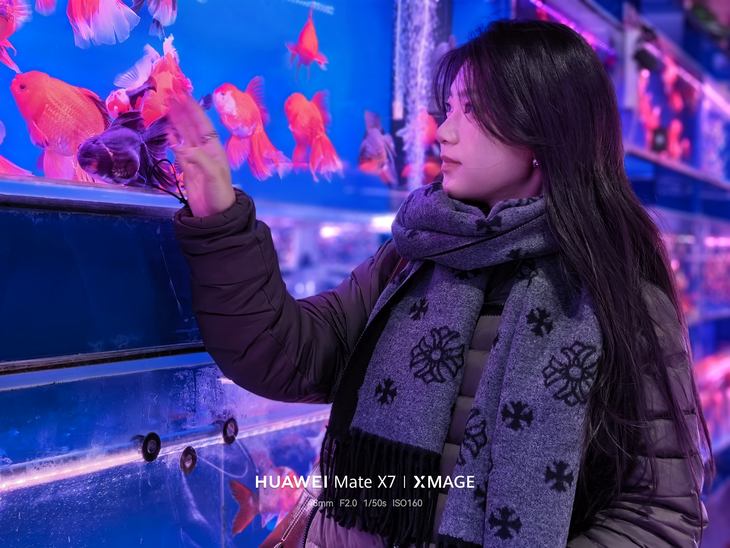 在光线比较复杂的室内环境中,非常考验手机的拍摄能力。从这一组在光线复杂的水族市场里实拍的样片来看,华为Mate X7搭载的第二代红枫原色摄像头,能够准确还原人物肤色,背景虚化效果自然柔和,给我的感受就是色彩还原非常真实。