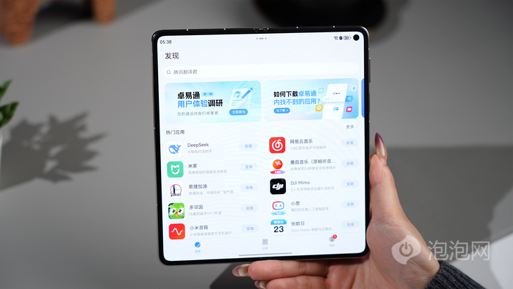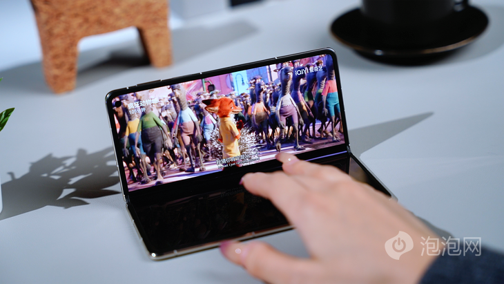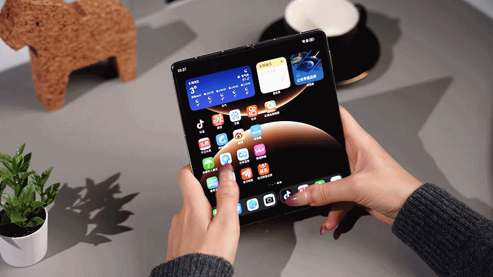 重点说下手机在展开后的轻薄体验,仅4.5mm厚度平放在桌上几乎和桌面齐平,8英寸内屏搭配四曲边框,手指划过边缘完全不硌手。