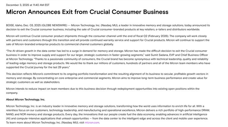 存储巨头美光昨日正式宣布,公司将全面退出旗下Crucial(英睿达)消费级存储业务,逐步停止通过全球零售商、电商及分销商销售该品牌产品。这意味着,自1996年创立、已在消费市场屹立29年的英睿达品牌,即将结束其历史使命。根据规划,美光的消费渠道出货与销售将持续至2026财年第二季度末(约2026年2月),公司承诺在此期间与合作伙伴紧密协作,确保平稳过渡,并继续为已售产品提供完整的保修与技术支持。此后,美光将把全部精力聚焦于向企业及商业客户提供美光品牌的数据中心与商用存储解决方案。