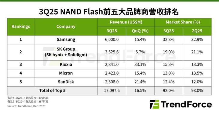 2025年Q3 NAND闪存营收季增16.5%,AI需求助推量价齐升
