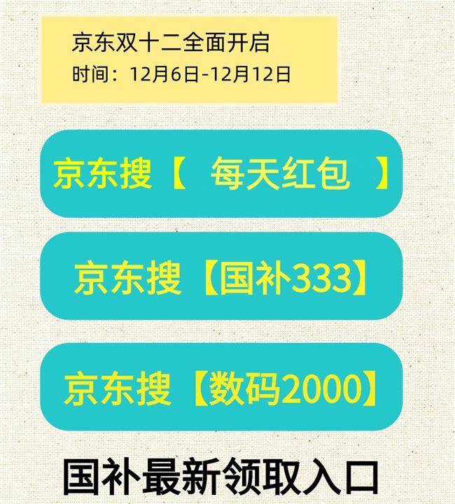 2025年最后一波“官方请客”福利已全面开启:红包领取持续到月底、国补截止至年底、爆款商品每天补货。记住操作口诀——“早上9:58设置闹钟→搜索口令领取优惠资格→10:00整点下单”。若遇到领不到国补的情况,解决方法是:在京东搜索“国补333”,即便没抢到国补券,也能直接打开京东搜索「国补333」进入超级国补专场,最高可减50%,全国通用!把这篇攻略分享到“相亲相爱一家人”群,12月每天都能享受双十二优惠,直接冲就对了!