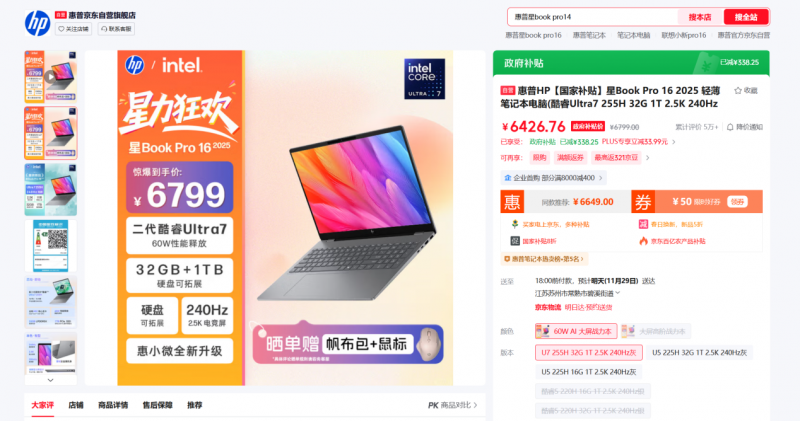 四、高性价比+多元选择,满足不同创作者需求在价格方面,惠普星 Book Pro 16 2025经过平台优惠叠加国补后,到手价仅6400 元左右(以页面实时价格为准),在同配置的轻薄本机型中具备极强的市场竞争力。当然,除了惠普星Book Pro 16 2025,市场上还有多款搭载英特尔酷睿Ultra 7 255H处理器的轻薄本可供选择,例如联想小新Pro 14 AI元启版,同样能为视频剪辑工作提供强劲性能支撑。