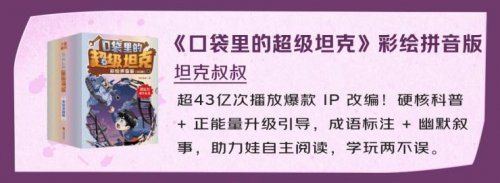 为孩子挑选合适的课外读物,也是许多家长的重点需求。坦克叔叔的《口袋里的超级坦克》彩绘拼音版依托超43亿次播放的爆款IP改编,把硬核科普和正能量成长引导融入趣味剧情,还贴心标注成语,大大降低孩子的阅读门槛,让孩子在探索坦克世界时既能学知识,又能培养自主阅读兴趣,真正实现学玩两不误。