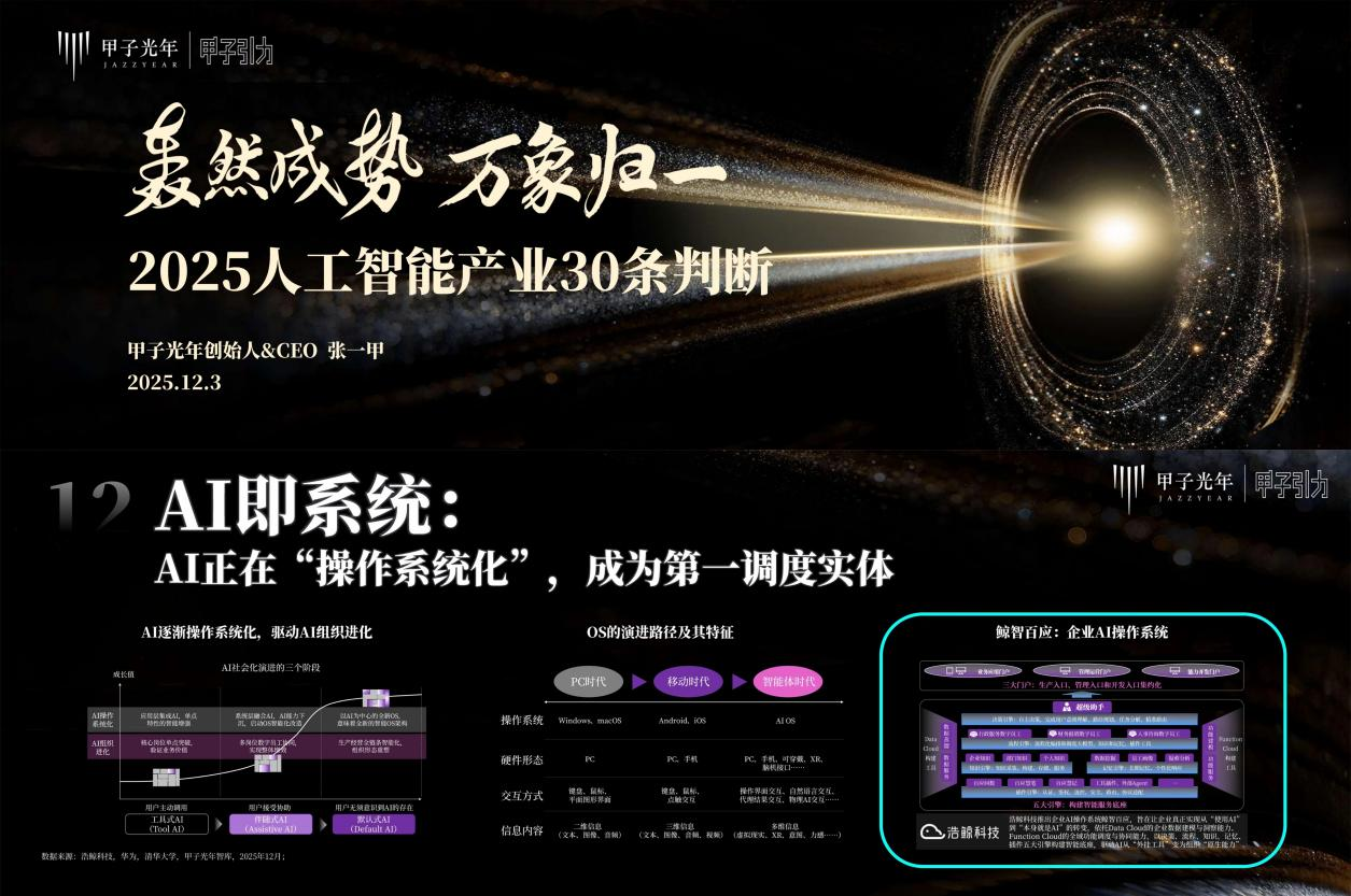 会上,浩鲸科技凭借 AI Agent 技术研发及产业落地的全方位卓越表现,荣膺「2025 中国 AI Agent 最具商业潜力企业」称号;其旗下企业AI操作系统“鲸智百应”,也凭借精准的产业定位与实践价值,成功入选甲子光年《2025 年人工智能产业 30 条判断》推荐案例。