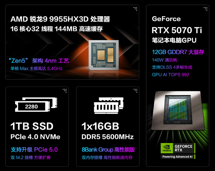 显卡方面采用的是NVIDIA GeForce RTX 5070Ti笔记本电脑GPU,支持140W满功耗释放。其拥有12GB大显存,为AI大模型的本地运算提供了更好的支持。而DLSS 4多帧生成技术可以提升游戏帧率表现,为游戏玩家带来稳定的高帧率表现。