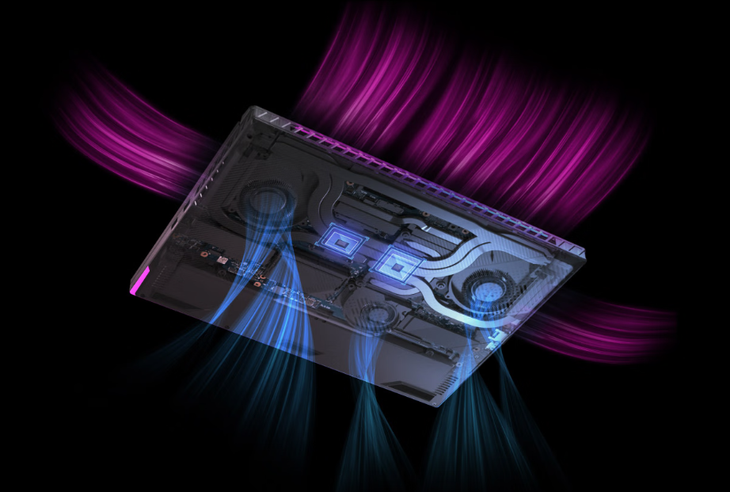 ROG魔霸9采用了冰川散热架构3.0,内置3风扇、7热管,配合独特的内吹式散热技术与环绕式出风,可以将热量快速排出机体,从而实现长效稳定的高性能释放。得益于出色的散热表现,ROG魔霸9双烤功耗可达215W,性能强大。