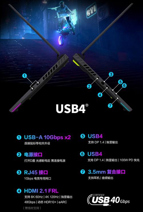 接口方面,ROG魔霸9配备了2个USB-A 10Gbps接口、2个USB-4接口、HDMI 2.1 FRL接口、3.5mm耳机孔以及RJ45网口,接口全面,满足用户的扩展需求。