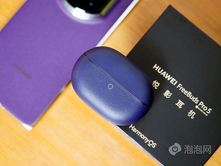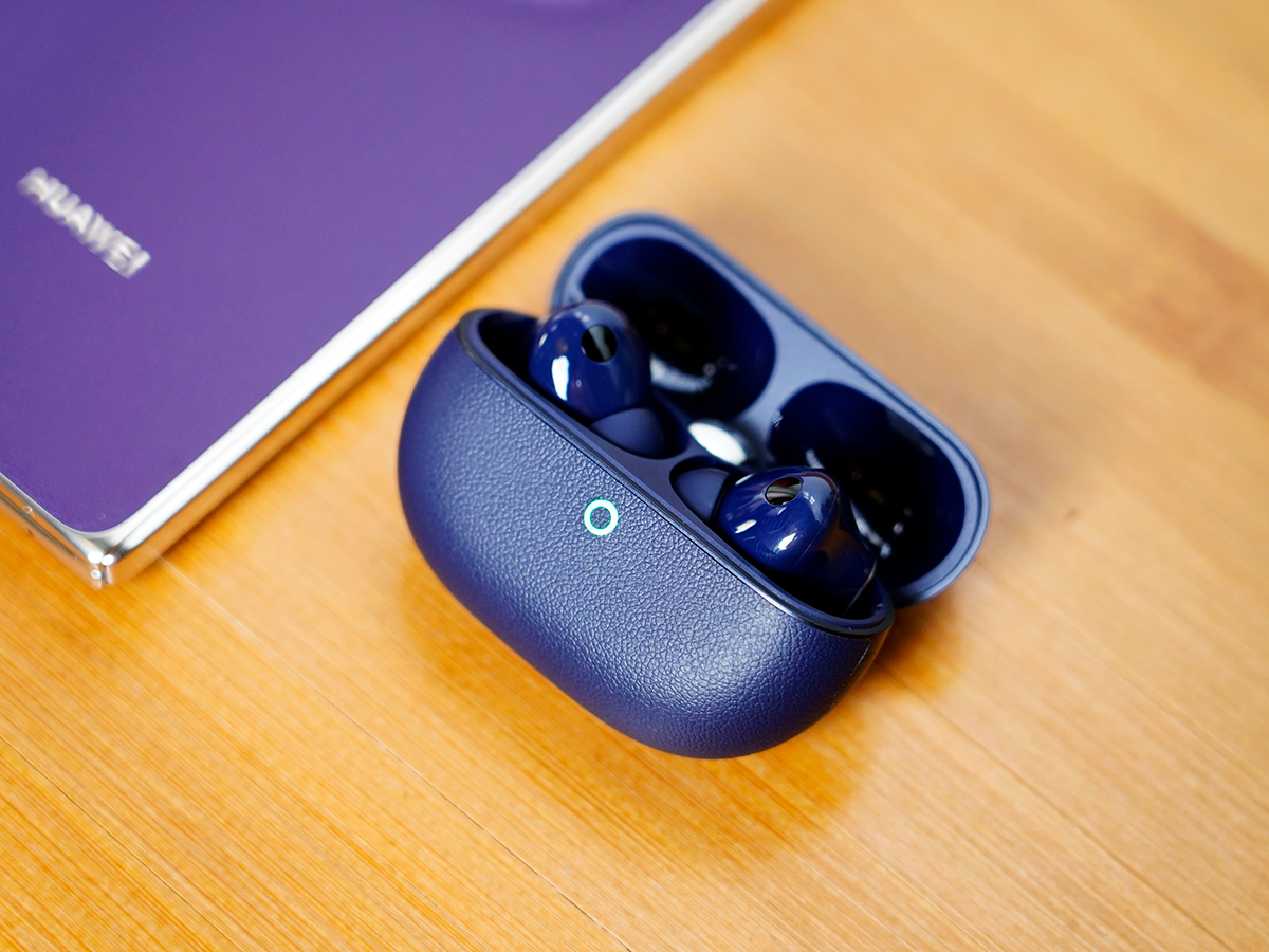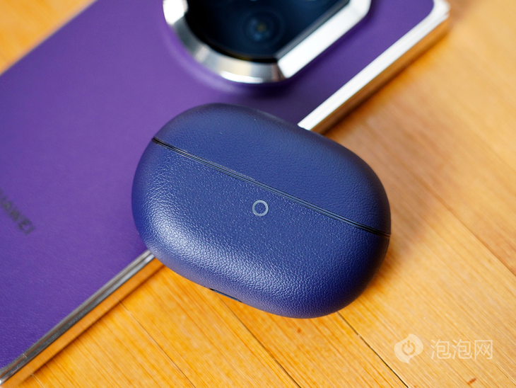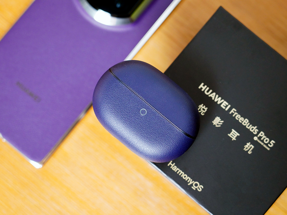华为 FreeBuds Pro 5整体造型圆润流畅,雪域白、冰霜银、大地金、穹宇蓝四款配色,不同的配色在外观上稍有不同,比如我们手中的这款穹宇蓝,它采用的是素皮充电仓,通过3D超深曲面拼合工艺,让素皮可以更贴合表面,呈现更精致的外观。