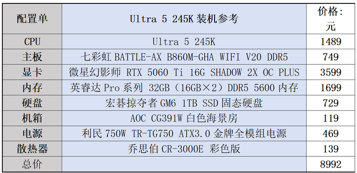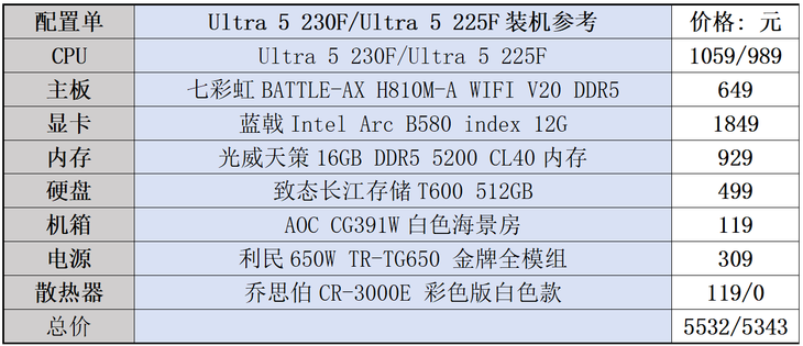 对于学生群体和预算有限的入门创作者,Ultra 5 230F和Ultra 5 225F都是能兼顾游戏、创作与未来AI应用的“多面手”。搭配甜品级显卡和H810主板在预算有限的情况下都是非常合适的选择。而且Ultra 5 225F还自带散热器,对于预算有限的用户相当友好。下面就给大家推荐一套很有性价比的配置,大家也可以根据自己的使用需求做出更多修改。