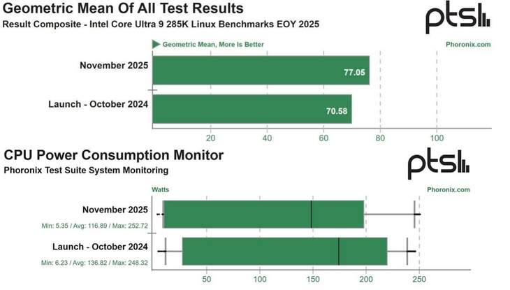 外媒Phoronix最近针对旗舰产品Ultra 9 285K的测试显示,经过一年的驱动和软件优化后,性能对比发布时平均提升约9%,同时功耗对比发布时降低15%。这样的表现对于有的产品来说已经是迭代级别的提升了,但这次英特尔仅仅通过微码、BIOS和驱动更新和软件优化就达到了这样的提升,对于消费者来说显然是白赚的性能。