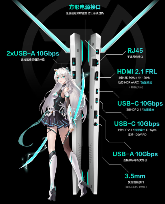 接口方面,华硕天选6 Pro锐龙版还能满足你对电脑的扩展需求,它拥有3个USB-A 10Gbps、2个USB-C 10Gbps接口,支持DP2.1协议和PD充电,可以实现独显输出,以及多显示器的组合。