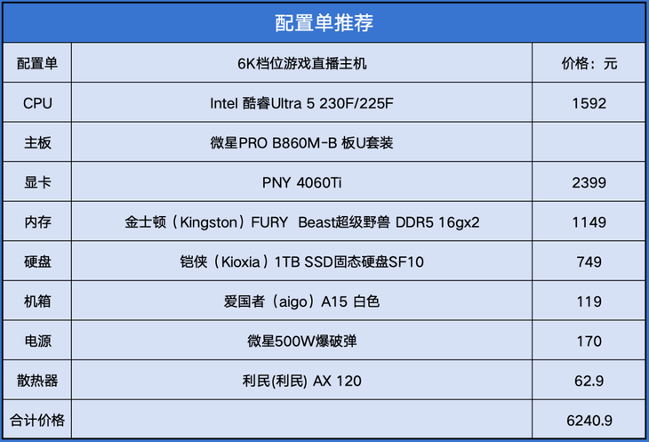 当然,上面的都是相对专业的游戏主播推荐,对于主流的用户,想要体验一下游戏直播,但是预算也不是特别充足,6K左右的整机预算,那么还可以考虑英特尔酷睿Ultra 5 230F/225F,搭配上RTX 4060或者5060,一般的游戏+直播推流,完全没有任何问题。