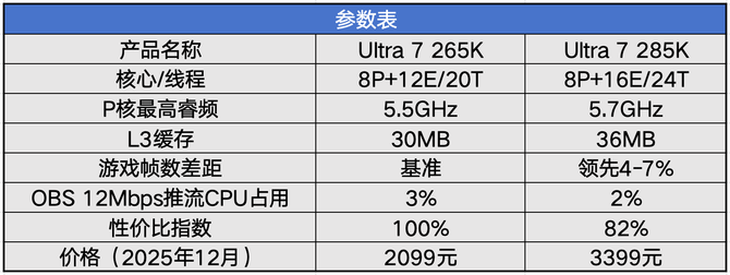 规格对比:英特尔酷睿Ultra 7 265K & Ultra 9 285K:一张表看懂该省还是该冲