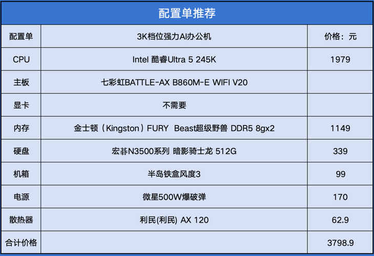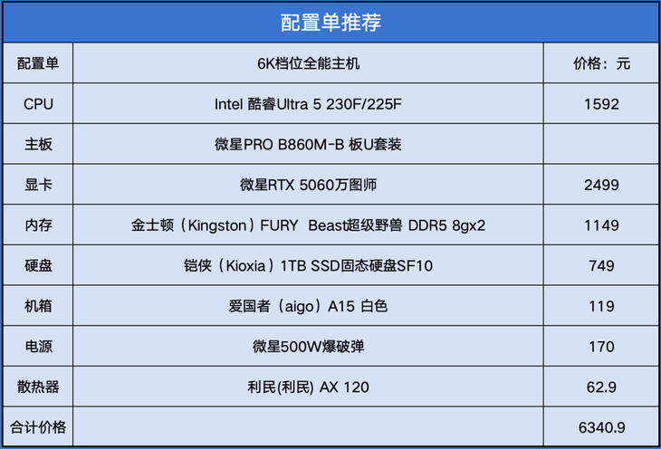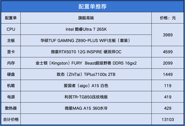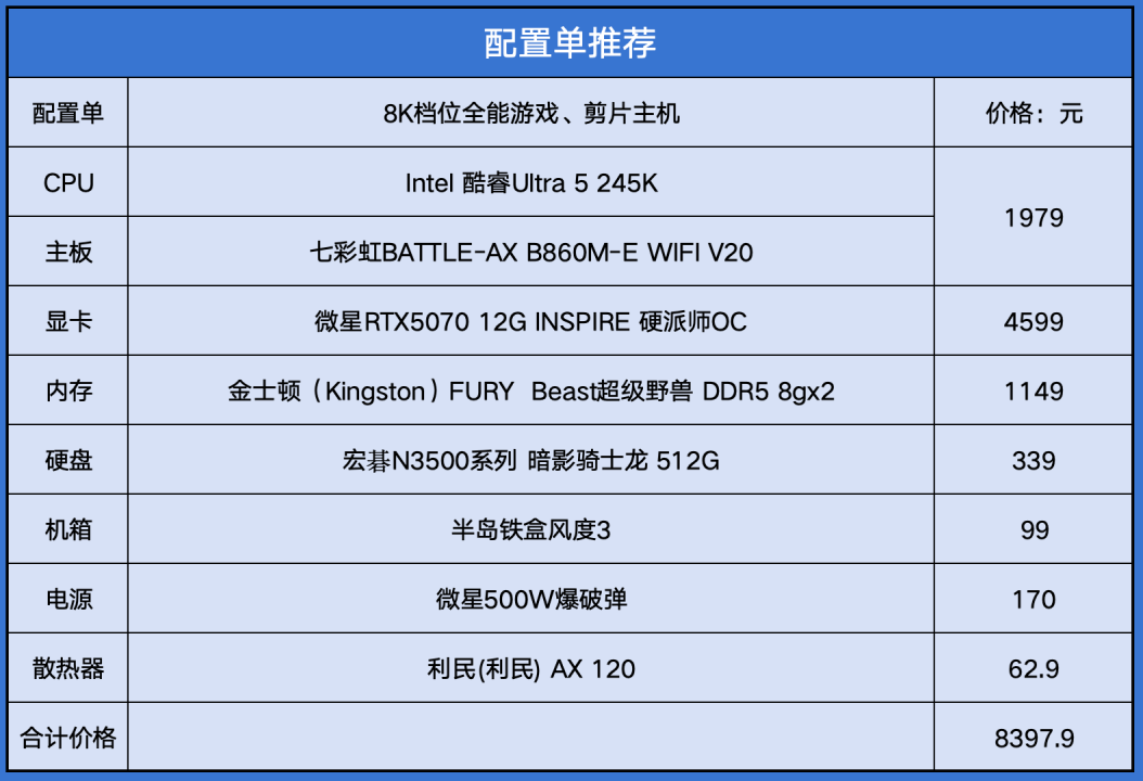 这套中高端的配置从价格来讲,已经突破了1W元,属于预算偏足,并且讲究均衡的配置,首先主板+CPU的配置的套装,相对于独立采购每个硬件,要节省不少,并且英特尔酷睿Ultra 7 265K作为上代14700K的升级,在多线程和AI性能表现有着明显的提升,尤其是能耗比相对于上代提升非常大。