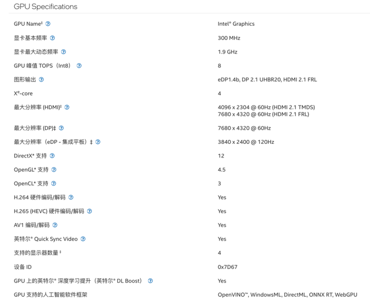 并且集成了全新一代的核显,这一代的核显用了和独立显卡同样的Xe-HPG架构,拥有4组Xe核心,基础频率为300MHz,动态加速频率可以达到1.9GHz,并且支持各类视频解码,包括AV1硬解码,同时也支持8K视频的高清输出,以及兼容英特尔的深度学习技术,越用越智能,还有各类AI软件框架也都支持。