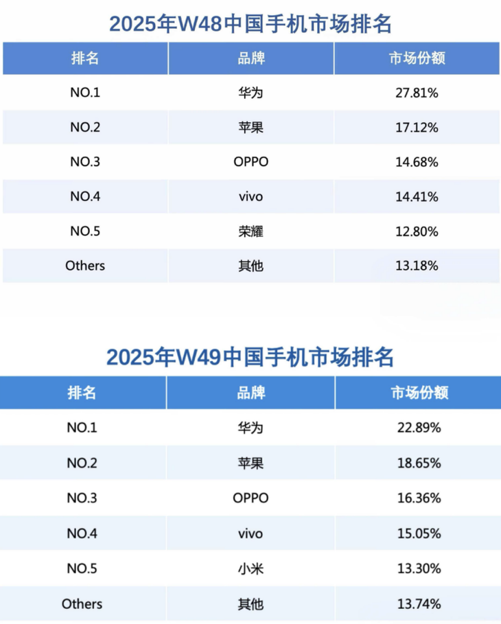 根据权威三方机构数据,自华为Mate 80系列发布以来,华为手机国内市场份额连续2周超越苹果,重夺国内市场份额第 一。