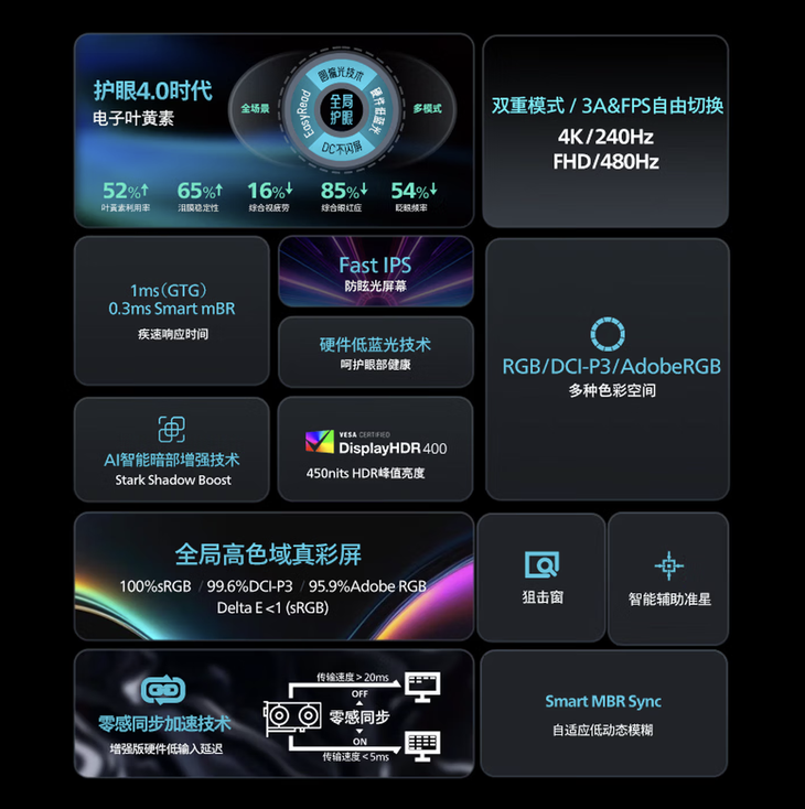 在护眼方面,该显示器引入“电子叶黄素”概念,据称可提升叶黄素利用率52%、泪腺稳定性65%,并显著降低综合性红斑与视觉疲劳。其硬件低蓝光技术与防眩光屏幕进一步保护长时间使用的眼部健康。此外,产品支持AI智能暗部增强、智能辅助准星、零感同步加速等技术,并配备Smart MBR Sync自适应低动态模糊功能,助力游戏画面更清晰流畅。