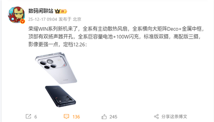 据数码博主的爆料,荣耀WIN系列全系都配备了主动散热风扇,这种设计位于后摄右上角的圆形模组,同时还标配金属中框。这一配置将显著提升该系列的性能释放,其中高配版将搭载高通第五代骁龙8至尊版芯片,预计能够刷新同平台的跑分记录。