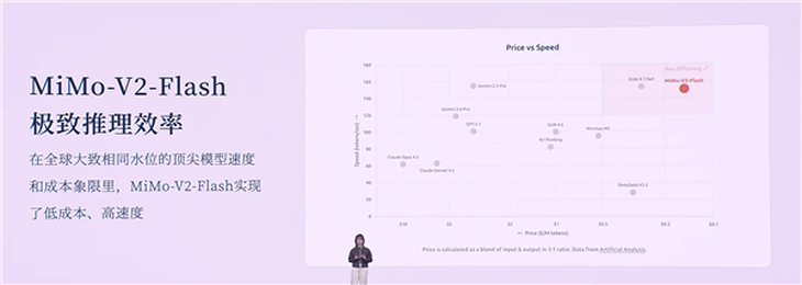 此外,MiMo-V2-Flash在全球顶尖模型的速度和成本对比中也表现出色,凭借低成本和高速度的优势,展现出其强大的市场竞争力。这使得它不仅适用于深度思考,还能够进行联网搜索,提供自然流畅的对话体验,并在需要实时数据和最新动态的场景中发挥重要作用。