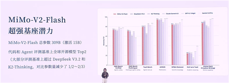 尽管MiMo-V2-Flash的总参数仅为309B(激活15B),但它在代码和Agent评测基准上的表现已跻身全球开源模型的前列,甚至在多数评测中超越了DeepSeek V3.2和K2-Thinking。这一成就显示出小米在AI领域以小博大的潜力,成功实现了较低参数量下的高效能。