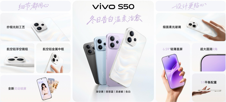 vivo S50提供「告白」「灵感紫」「悠悠蓝」「深空黑」四款配色。其中全新「告白」配色采用缎面柔光玻璃背板与纱缎光刻工艺,呈现白里透金的细腻光泽,温润不沾指纹,如冬日暖阳般治愈。