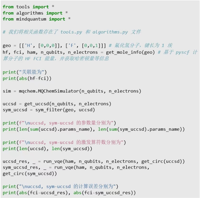 输出结果显示,引入对称性约束后,Sym-UCCSD 的参数量由 20 降至 11,激发算符数量由 35 降至 17。同时,两种拟设的计算误差均维持在10^-7量级,表明精简后的模型在降低复杂度的同时保持了计算精度。