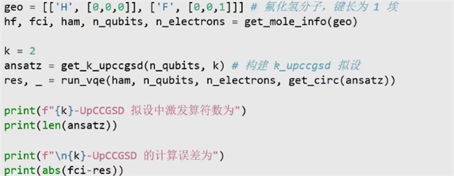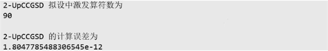 实验结果表明,2-UpCCGSD 拟设共包含 90 个激发算符,其计算能量与 FCI 理论值的误差仅为1.8 ×10^-12Ha,显示出该拟设在处理电子关联效应上的准确性。