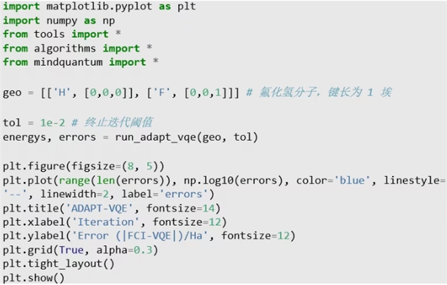 ADAPT-VQE 算法需要在每次迭代中评估算符池内大量算符的梯度。mqchem 模拟器的高效模拟能力可以显著缩短这一筛选过程的计算时间,提升算法整体的运行效率。
