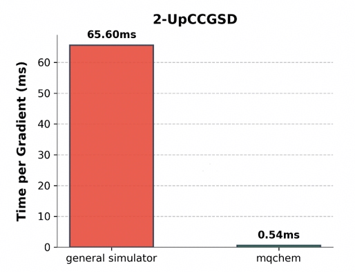 在变分算法中,参数梯度的计算效率直接影响训练速度。下图展示了单步梯度计算的时间开销。通用模拟器耗时 65.60ms,而 mqchem 模拟器耗时 0.54ms。这种在梯度计算上的性能优势,有助于加快多层拟设的参数优化过程。